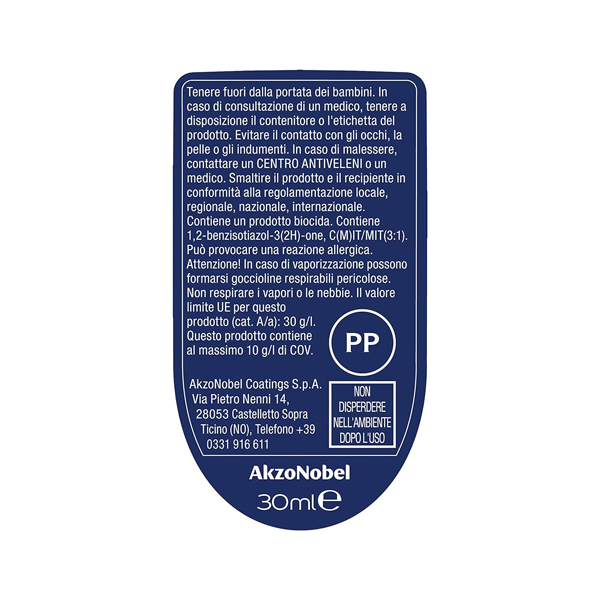 Può provocare una reazione allergica. Trattamenti quali carteggiatura, sabbiatura o rimozione con fiamma, ecc., degli strati di pittura, possono generare polveri e/o fumi pericolosi. La carteggiatura a umido deve essere utilizzata laddove possibile. Lavorare in ambienti ben ventilati. Indossare gli idonei mezzi di protezione individuale. Attenzione! In caso di vaporizzazione possono formarsi goccioline respirabili pericolose. Non respirare i vapori o le nebbie. Pitture opache per pareti e soffitti interni. Il valore limite UE per questo prodotto (cat. A/a): 30 g/l. Questo prodotto contiene al massimo 10 g/l di COV.
