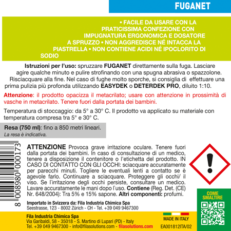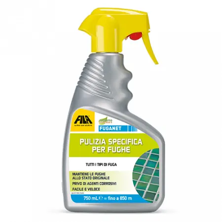 Fuganet Fila è un detergente spray che pulisce a fondo le fughe di pavimenti e rivestimenti ceramici: monocottura, bicottura, gres porcellanato con sola esclusione dei tipi assorbenti trattati a cera.