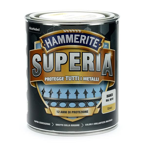 Hammerite Superia Opaco è uno smalto antiruggine di nuova generazione, a base acqua, formulato per applicazione diretta sulla ruggine e su qualsiasi tipo di metallo, senza necessità di utilizzare un primer.