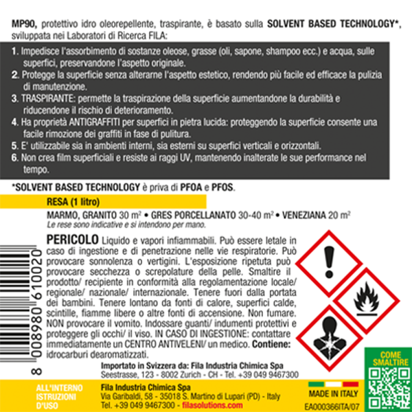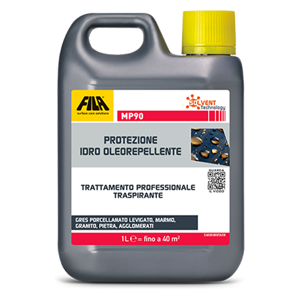 MP90 Fila è un protettivo antimacchia per superfici lucide base solvente della Fila. È la miglior difesa dalle macchie per gres porcellanato, marmo e granito con finitura lucida. È un anti-graffiti per superfici verticali in pietra naturale lucida.