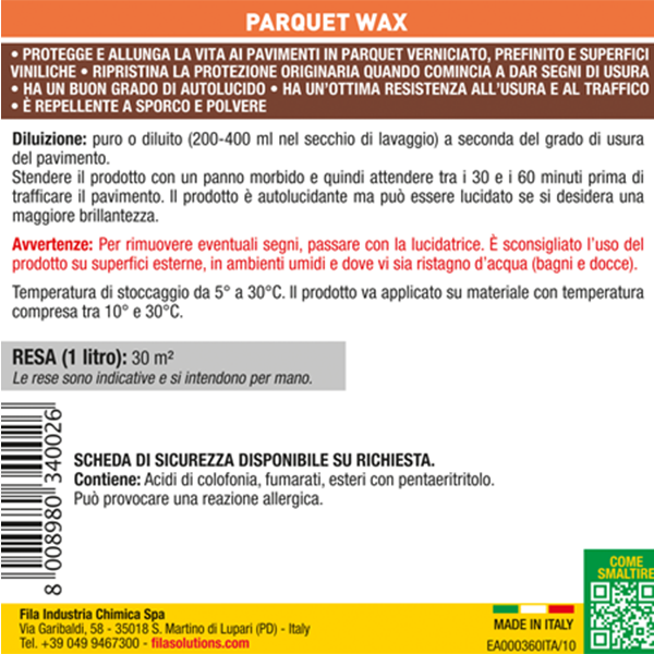 Parquet Wax Fila è una cera di manutenzione per parquet. Protegge, pulisce e allunga la vita ai pavimenti in parquet verniciato, prefinito e laminati plastici. Ripristina la protezione originaria quando comincia a dar segni di usura.